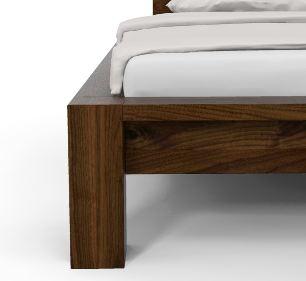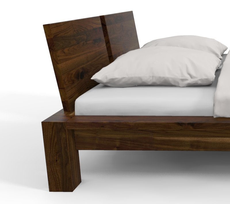 Das Bantam-Bett spielt mit den Kontrasten. Auf der einen Seite die schmale, 4 cm starke Rahmenkonstruktion und auf der anderen Seite die vier kräftigen Beinprofile. Die Beine durchstoßen die Rahmenkonstruktion und zeigen ihr Stirnholz. Sie sind zugleich ausschlaggebend für die Auflagenbreite des Rahmens.